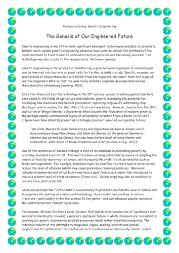This current paper discusses the pros and cons of using genetic engineering on plants, animals, and provides a synthesis, arguing that, despite its disadvantages, it still serves as a pivotal advantage not only within the scientific community, but also society. The impact of genetic engineering on society can be seen at various aspects, essay on genetic engineering, affecting various aspects of social and physical organic life, especially in terms of human beings. The practice consists of the specific selection and removal of genes from organic organisms and inserting them into another. The practice, though still young in practice and not yet deemed completely socially acceptable, essay on genetic engineering, makes the possibility of curing diseases once thought incurable a reality, thereby inherently improving the life of both humans and non-human animals.